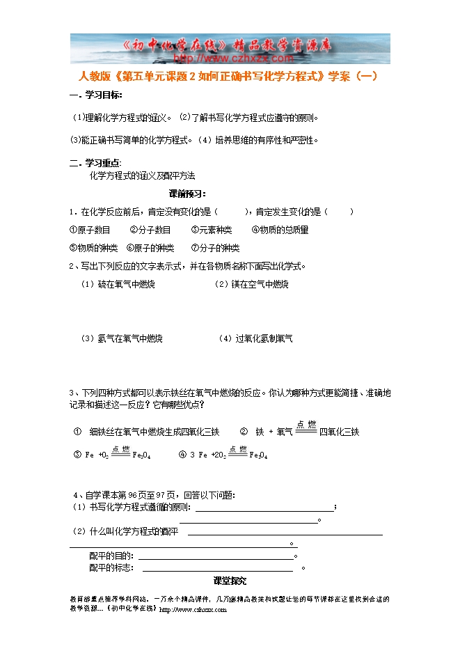 人教版《第五单元课题2 如何正确书写化学方程式》学案(一)