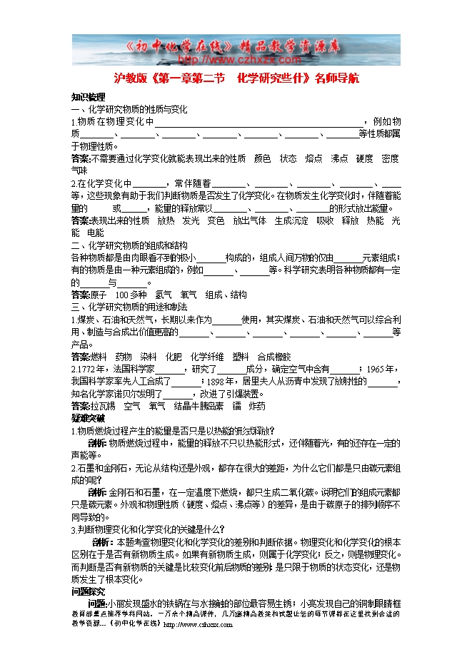 - 下一份试卷:沪教版《第一章第三节 怎样学习和研究化学》名师导航