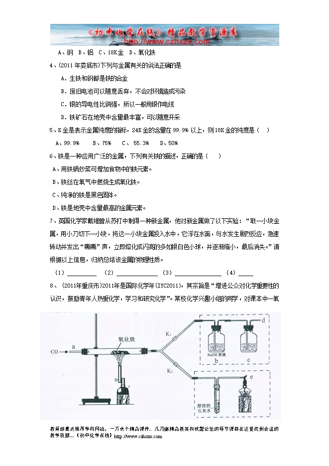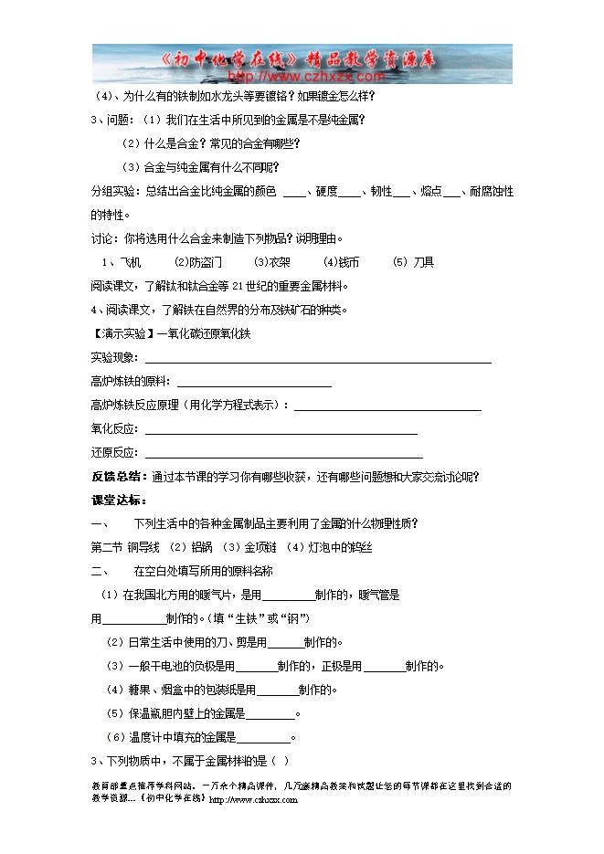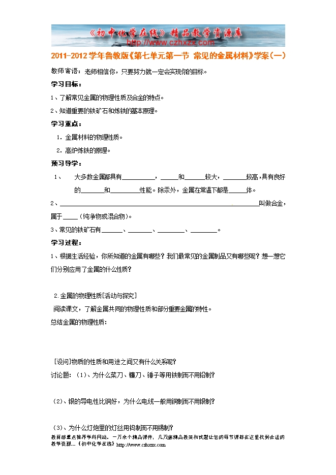 2011-2012学年鲁教版《第九章第一节 常见的金属材料》学案(一)