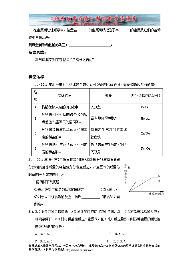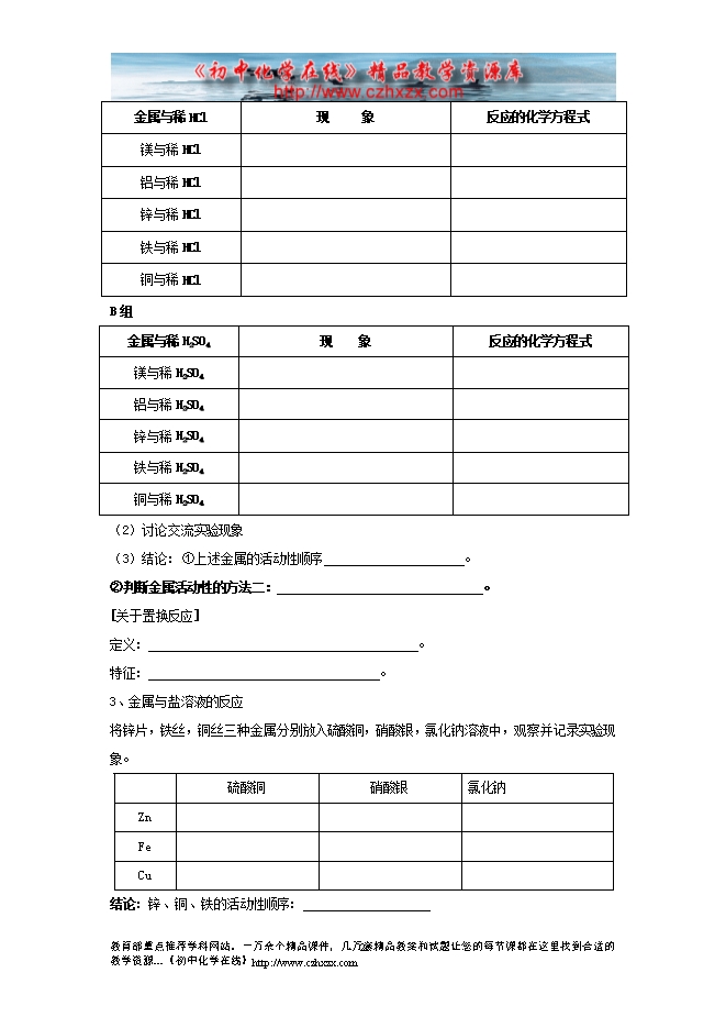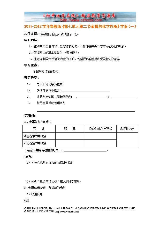 2011-2012学年鲁教版《第九章第二节 金属的化学性质》学案(一)