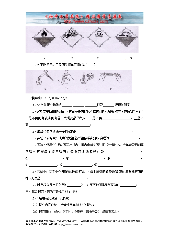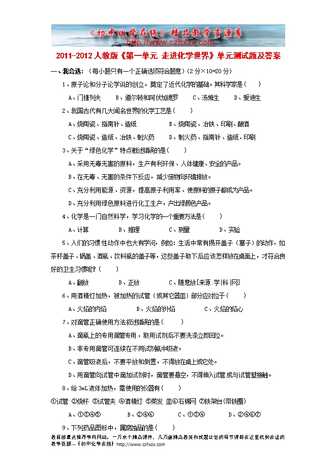 2011-2012人教版《第一单元 走进化学世界》单元测试题及答案