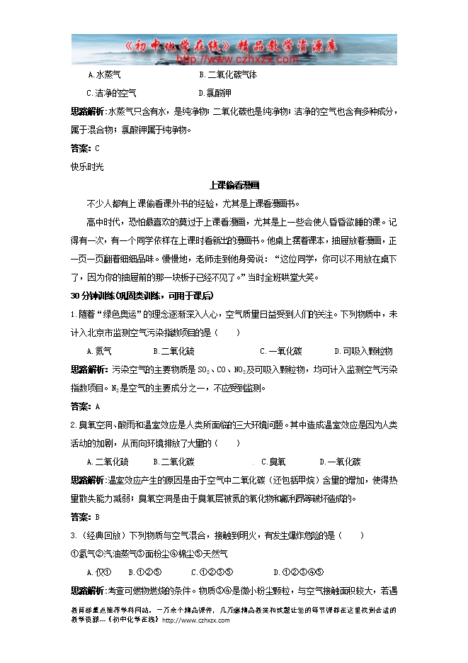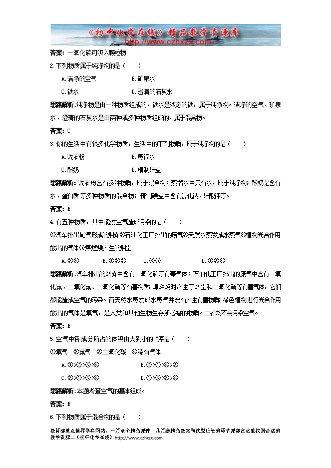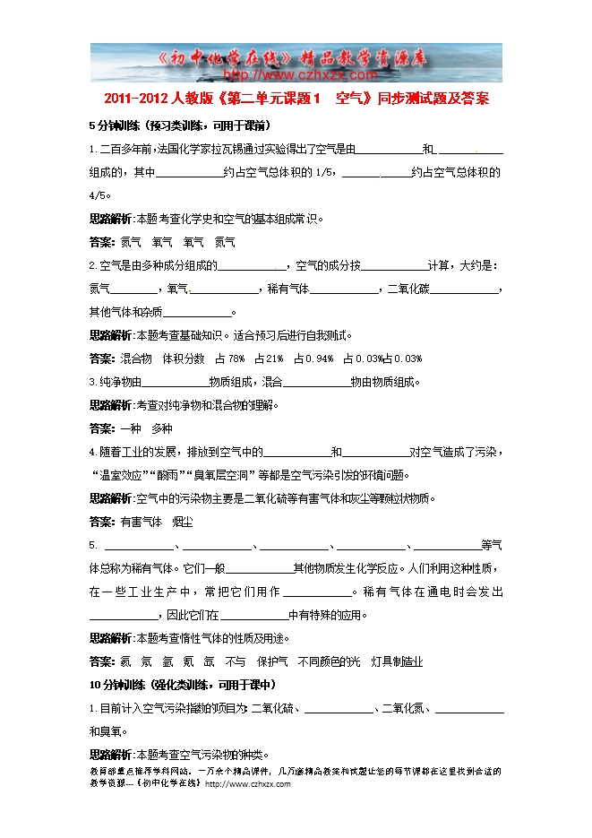 2011-2012人教版《第二单元课题1 空气》同步测试题及答案