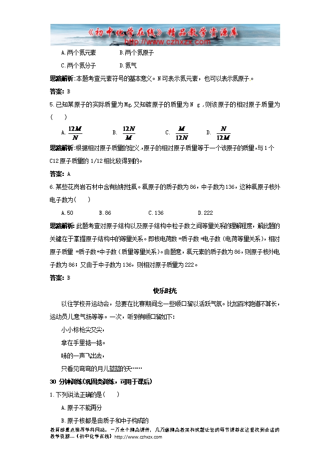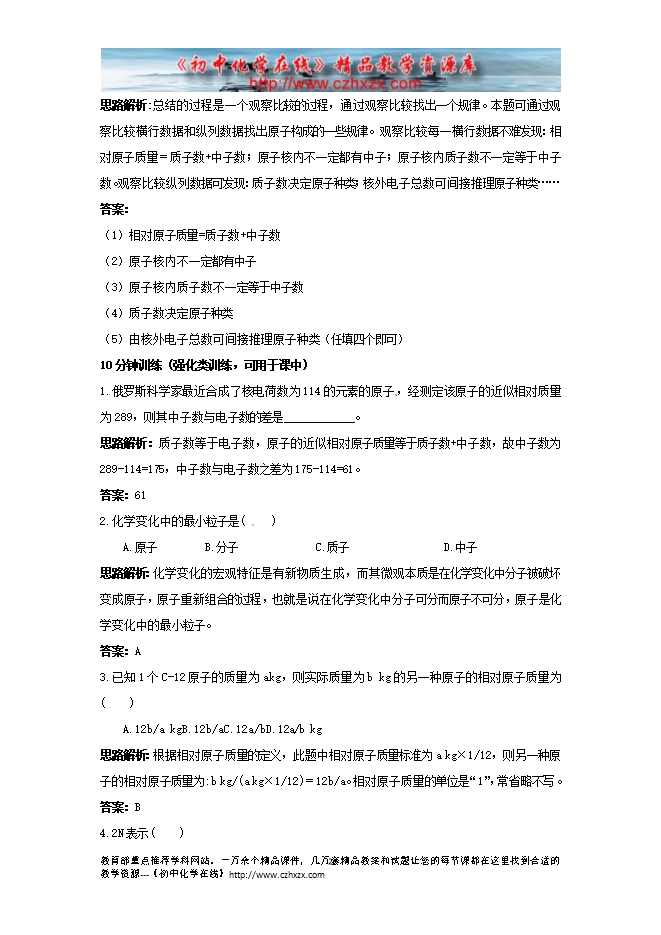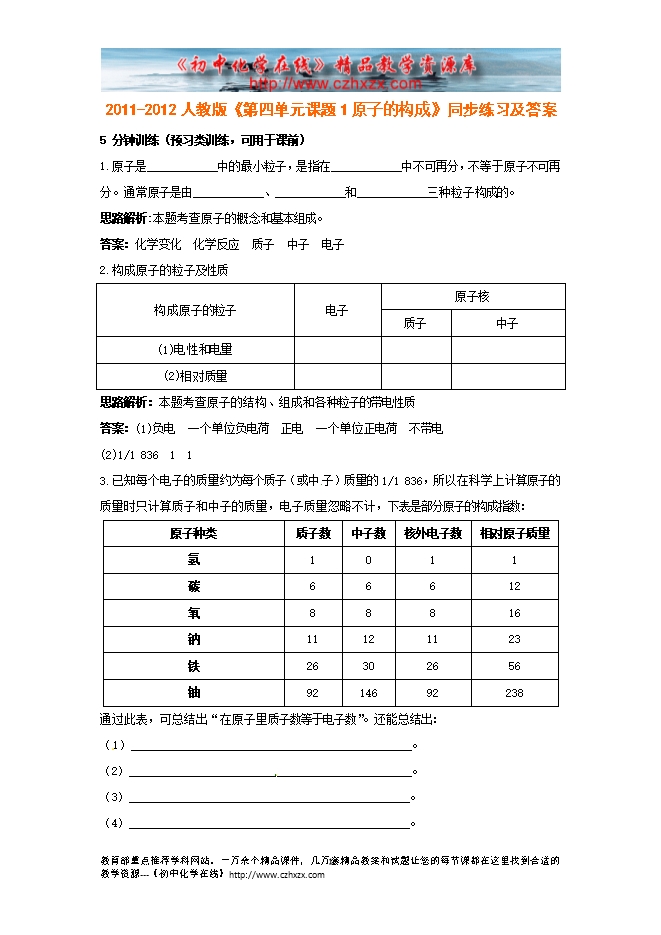 2011-2012人教版《第三单元课题2 原子的构成 》同步练习及答案