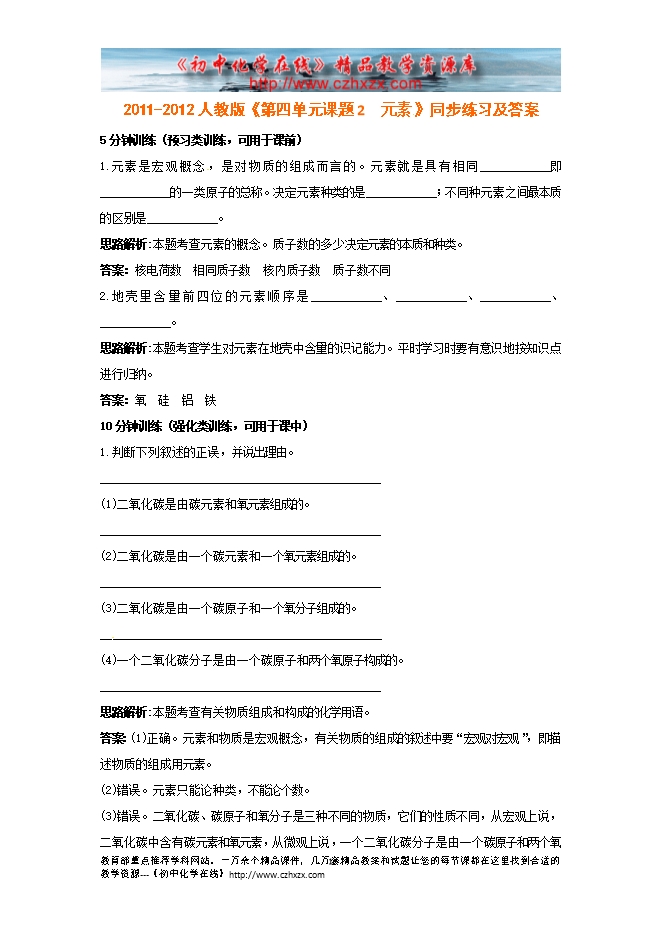 2011-2012人教版《第三单元课题3 元素 》同步练习及答案