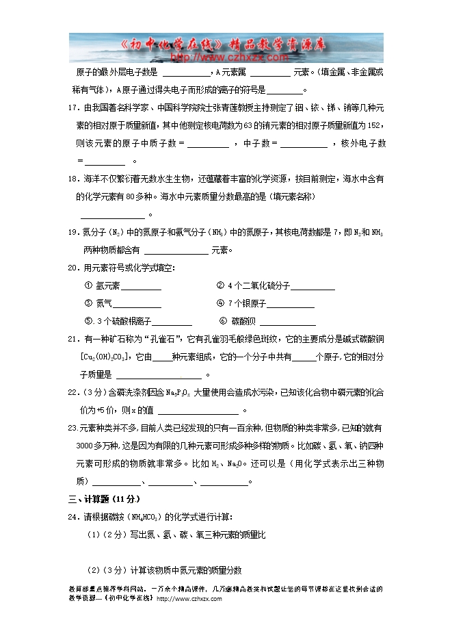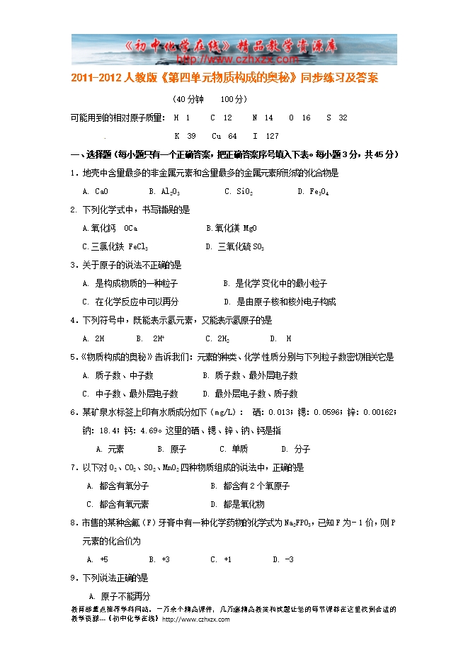 2011-2012人教版《第三单元 物质构成的奥秘》同步练习及答案