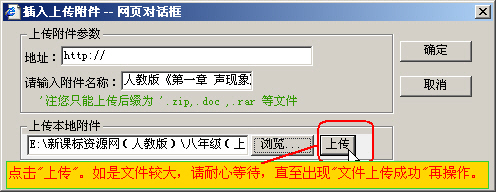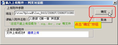 6. 插入附件:点击“上传附件”按钮,点“浏览”找到你已压缩的rar文件,再点击“上传”,直至出现“文件上传成功”, 单击“确定”。