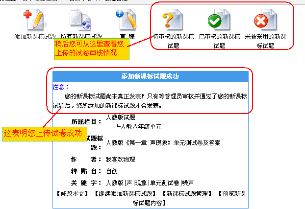 四、最后一定要记住点击“添加”,直至出现“添加新课标试卷成功”界面,才表明您上传成功!接下来等待的就是管理员的审核了,审核发表后即可给你下载点数。