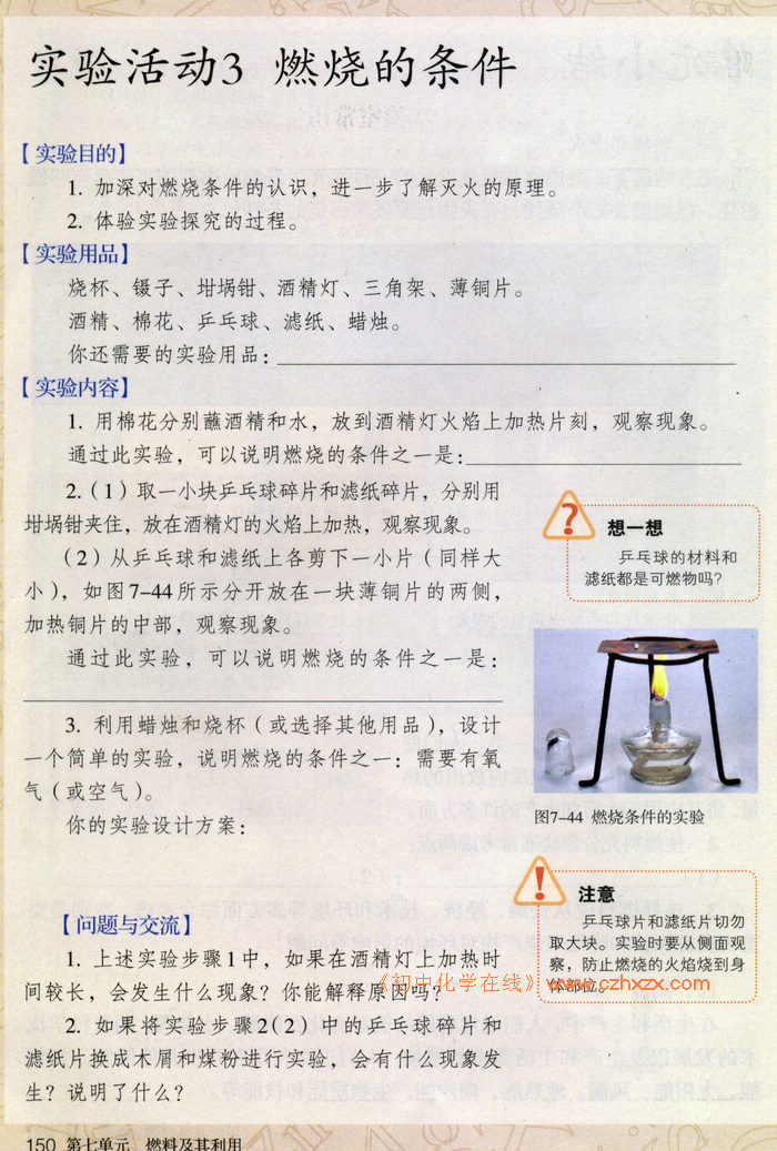 2012年新人教版化学九年级上册《实验活动3 燃烧的条件》电子课本