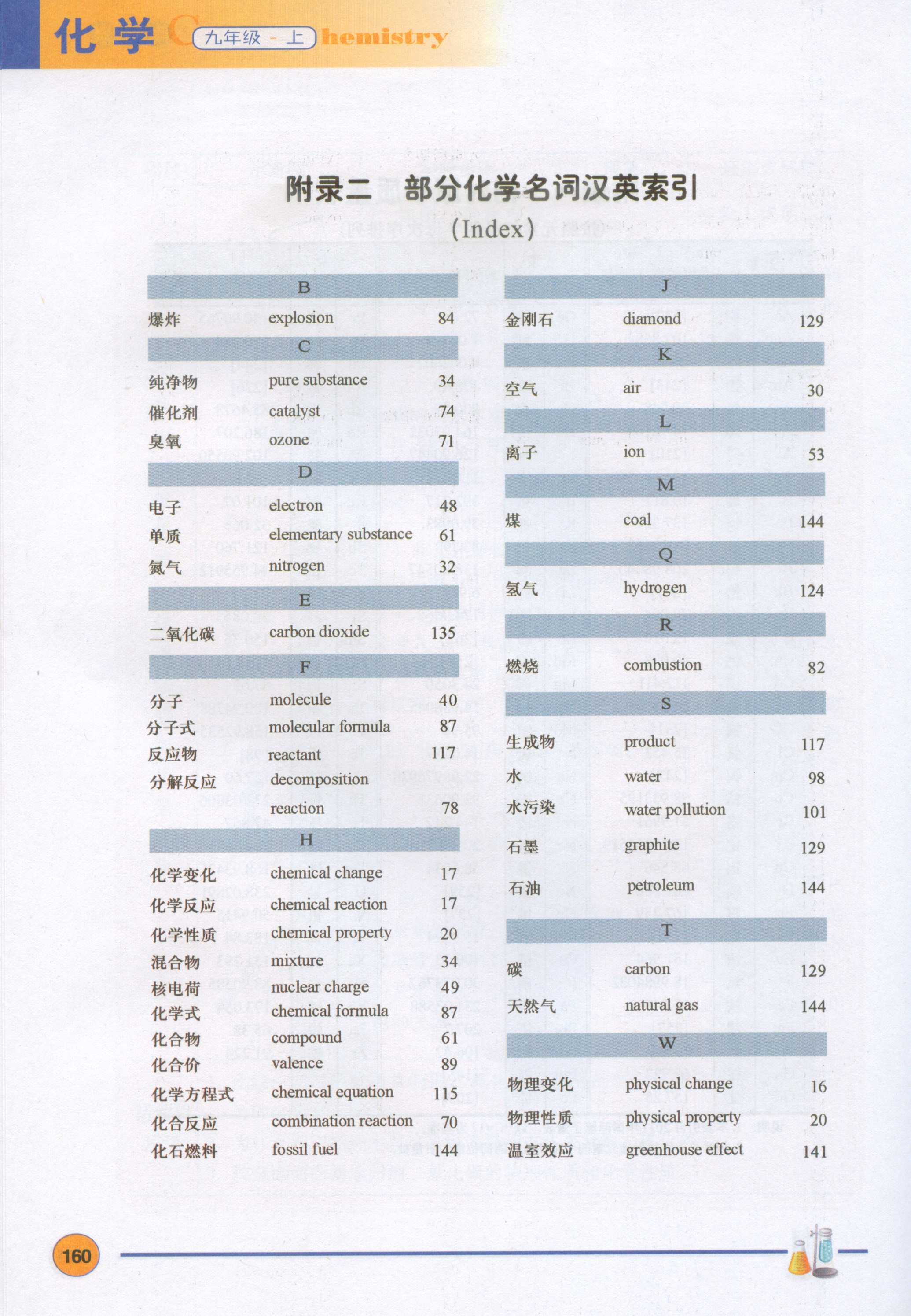 2012年新粤教版初中化学九年级上册电子课本:《附录二部分化学名词汉英索引》