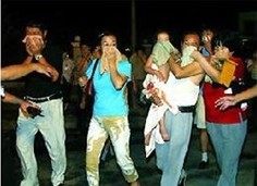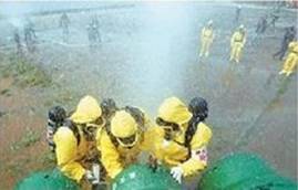 新华网报道:2005年3月29日,京沪高速公路淮安段一辆满载液氯的液罐车和对面来车相撞,大量液氯外泄。据目击者描述:“一股黄绿色的气体就像探照灯光一样,“唰”地射向高空,足有5米高,并有刺鼻的味道,眼睛也熏得有些睁不开。”事发后消防队员不断地用水枪喷射,但时值西南风,氯气迅速向西南方扩散,造成350人中毒进医院救治,另有28人中毒死亡的特大事故,附近居民采取应急措施,疏散到一高坡上。(图1、2)