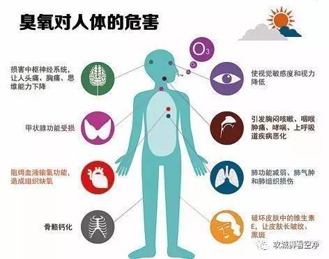 臭氧也会刺激眼睛,使视觉敏感度和视力降低。它也会破坏皮肤中的维生素E,让皮肤长皱纹、黑斑;当臭氧浓度在200微克/立方米以上时,会损害中枢神经系统,让人头痛、胸痛、思维能力下降。